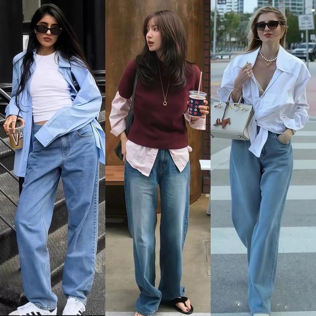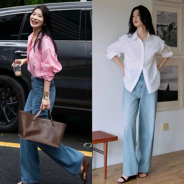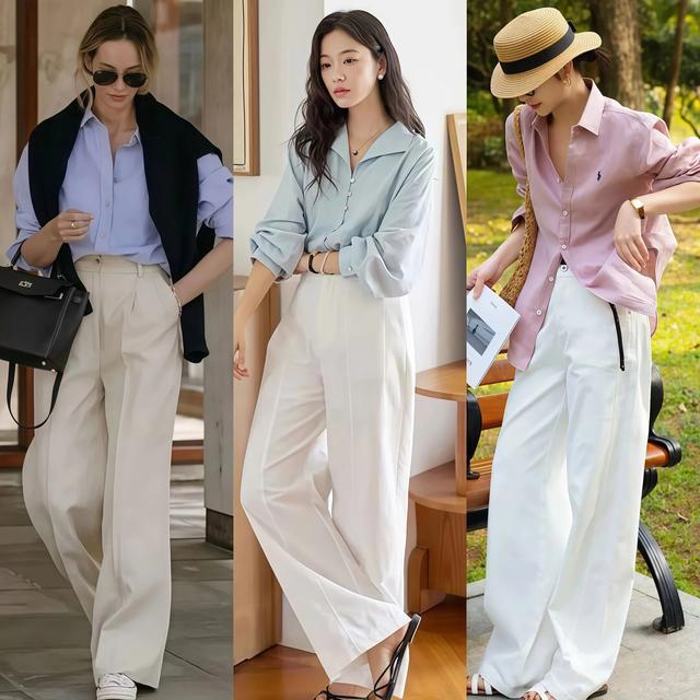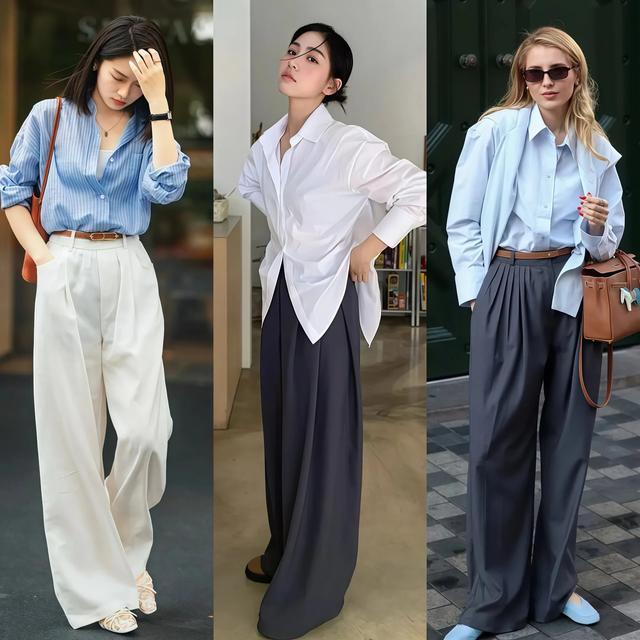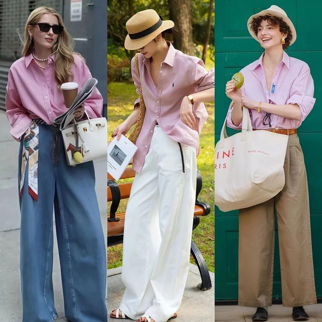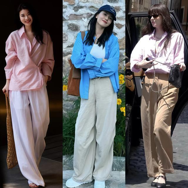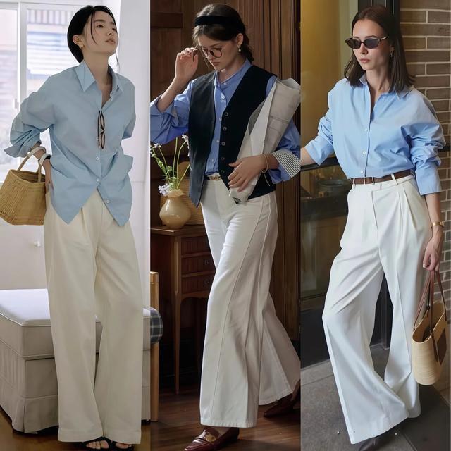 白衬衫是永远的安全牌什么颜色的阔腿裤都接得住,蓝衬衫是这两年特别火的选择,尤其中等饱和度的蓝色上身之后提气色超级明显皮肤白好几个度,粉衬衫适合走温柔路线的女生,浅粉色搭白色阔腿裤减龄效果满分。