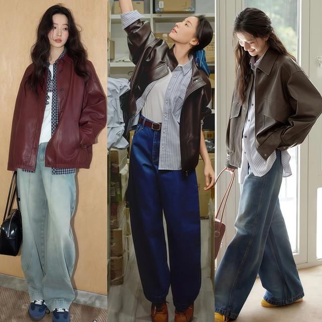 春天早晚温差大的时候在衬衫外面套一件短款皮衣,皮衣硬朗的面料碰上衬衫阔腿裤的温柔,穿出来帅气里裹着柔和,短款长度卡在腰线还能拉高比例,这组搭配我太爱了真的谁穿谁好看。