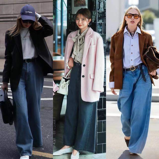 上班穿什么这件事别再纠结了,衬衫配阔腿裤外面套一件西装外套,闭眼穿都不会出错,颜色选同色系的搭配比如深蓝西装配牛仔阔腿裤,色调统一干练得体靠这一套搞定每天通勤。
