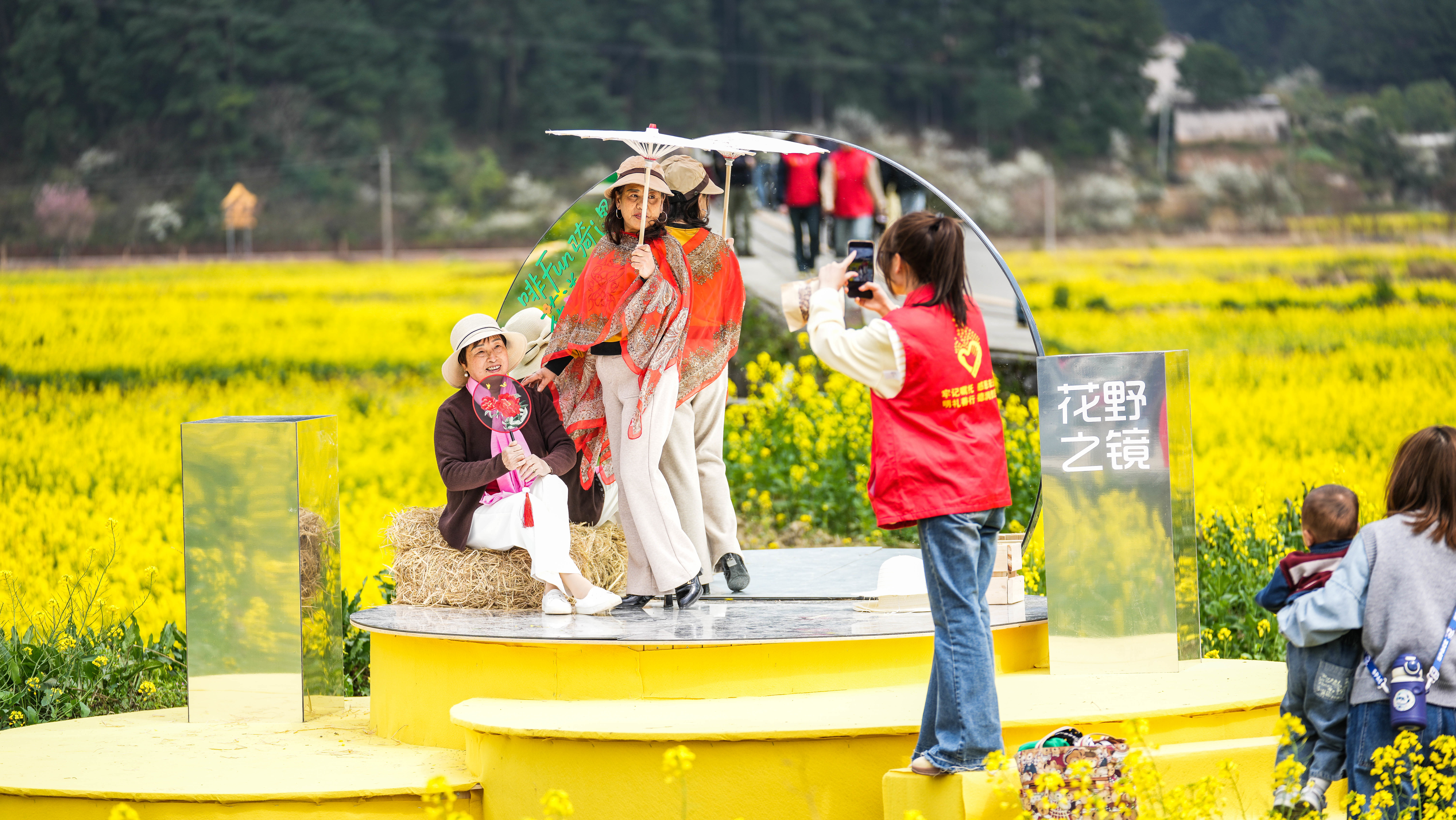 3月13日,志愿者在贵州省贵定县盘江镇“金海雪山”景区内帮助游客拍照。