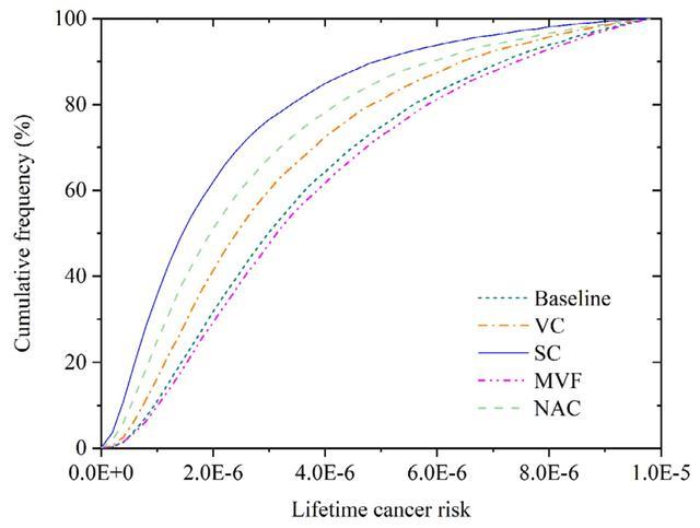 不同策略下终生癌症风险的累积频率。